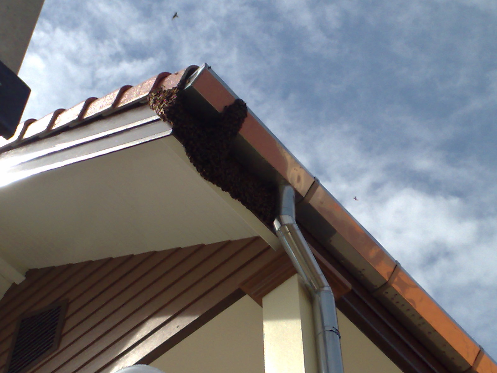 Another swarm of honey bees decided to relocate down from the jungle to the eve of our neighbors house.